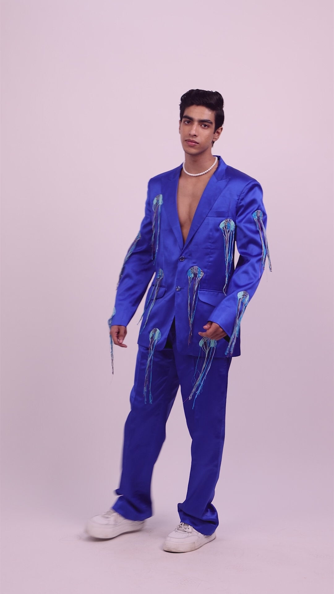 The perfect blend of comfort and style with our relaxed fit satin blazer. Adorned with stunning jellyfish embroidery and practical pockets, this piece is designed for the modern individual. Complete the ensemble with our matching satin pants for a polished appearance.